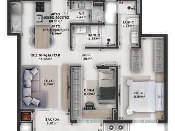 - Área Privativa: 69,61 m²