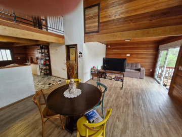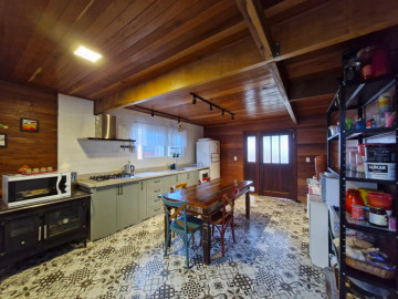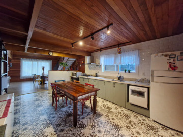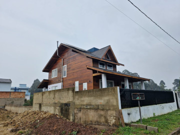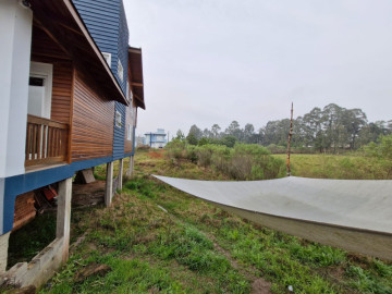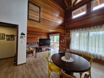 Casa Mista com 2 pavimentos, contendo no piso inferior sala de estar/jantar e TV com pé direito duplo, cozinha integrada com planejados e fogão a lenha de dupla combustão, bwc, 1 dormitório, nos fundos lavanderia e varanda, na frente varanda e ao lado terraço (externo) para lazer.