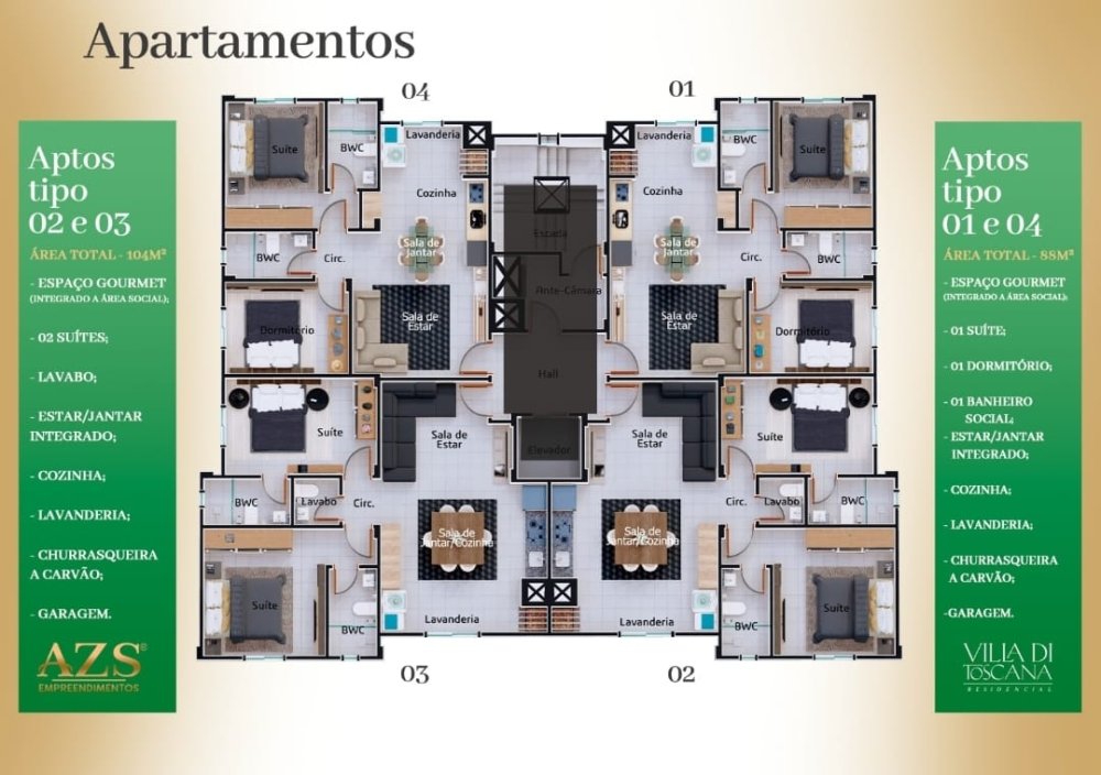 *APARTAMENTO TIPO 01 E 04 Área total 88,00m²